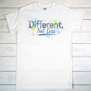 Stand proud in who you are 💙 Add the Different Not Less Watercolor T-Shirt to your cart today and help spread a message of acceptance, strength, and individuality!